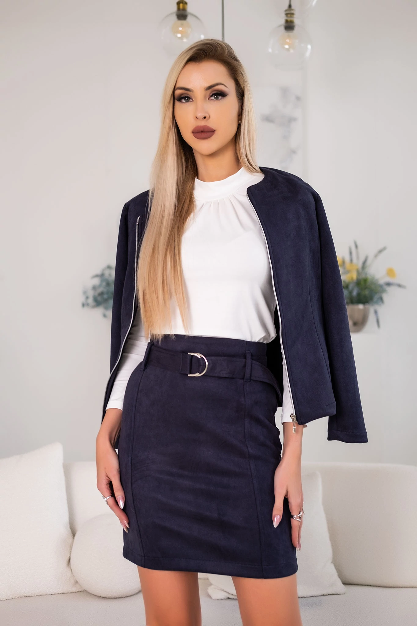 Testhezálló fazonú velúr szoknya, övvel. Elején hosszanti szabásvonalak.