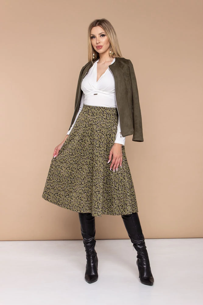 Egyenes vonalú, bélelt szoknya, mely hátul rejtett cipzárral záródik. Alja lézervágott motívumokkal díszítve.