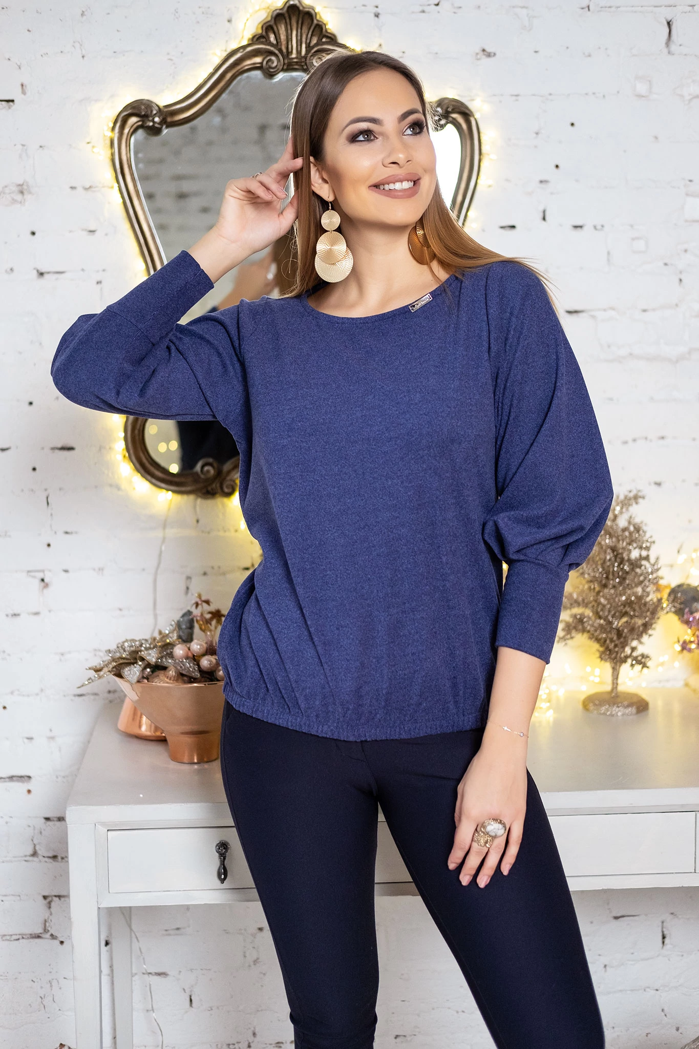 Lezser fazonú, kerek nyakkivágású, alul gumis tunika. 3/4-es ujjai passzéban végződnek. |