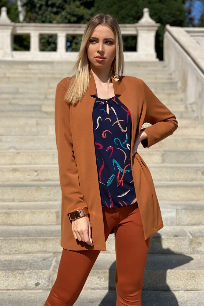 Karcsúsított fazonú elegáns blézer, elején egy gombbal záródik.