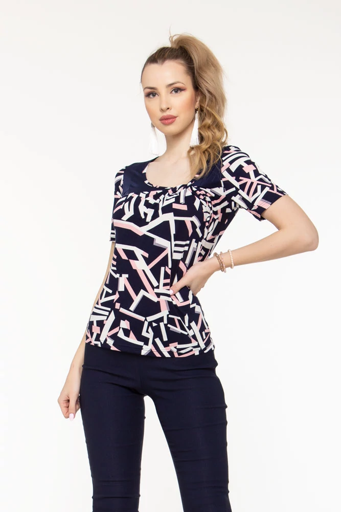 Lezser szabású, rövidujjú póló. Eleje átlapolt, a fehér bélelés a termék részét képzi.
