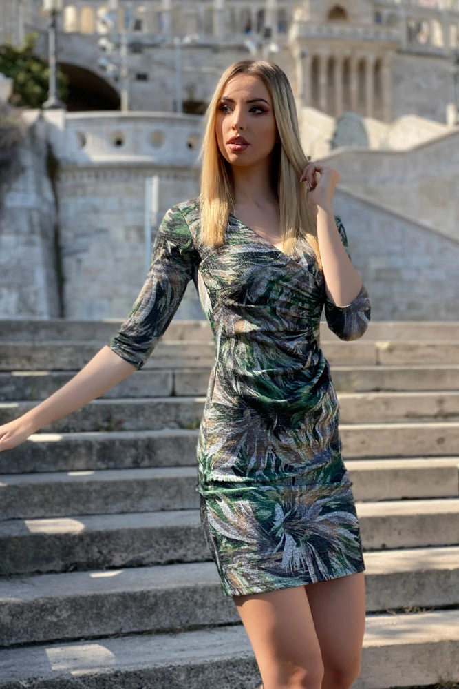 Szűk fazonú mini ruha, rövid ujjakkal és "V" nyakkivágással.
