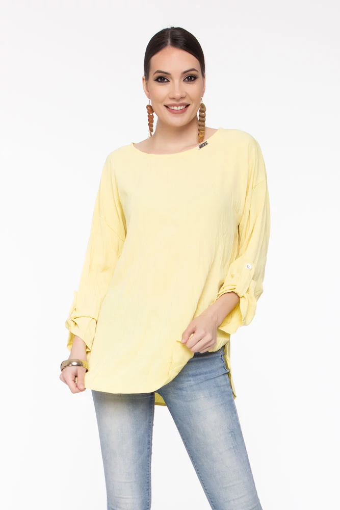 Laza szabású, gyűrt felső, 3/4-es ujjakkal, ujja végén kis gombolópántokkal. Anyagösszetétel: 95% poliamid, 5% elasztán |