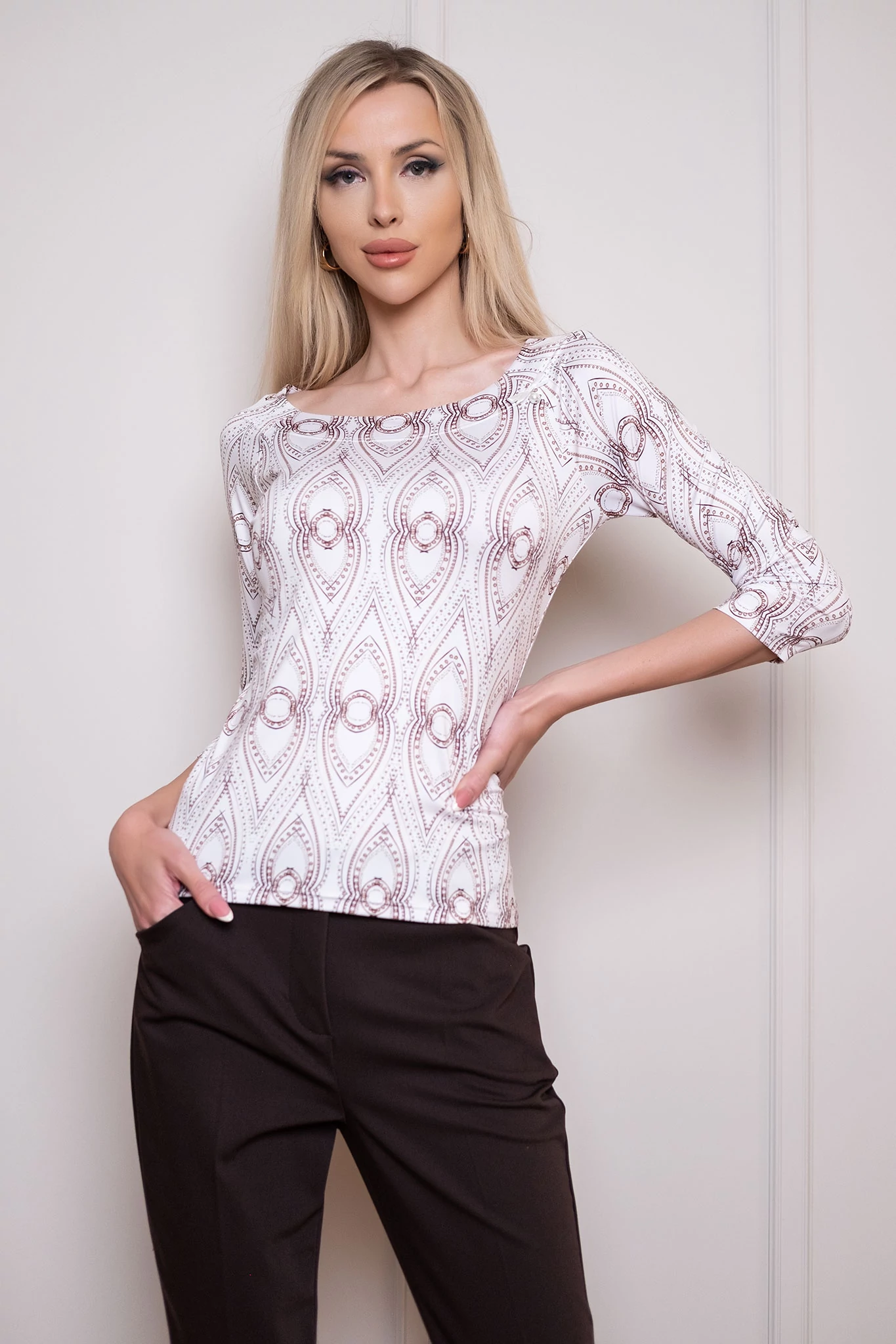 Testhezálló fazonú, 3/4-es ujjú felső. Csónaknyaka elegáns ékbetéttel díszített, ujjai passzéban végződnek.