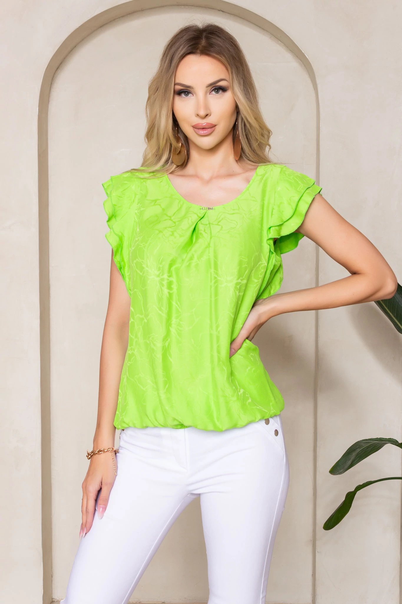 Laza szabású, ujjatlan blúz vállán fodrokkal. Dekoltázsa rakott, logóval díszített. |