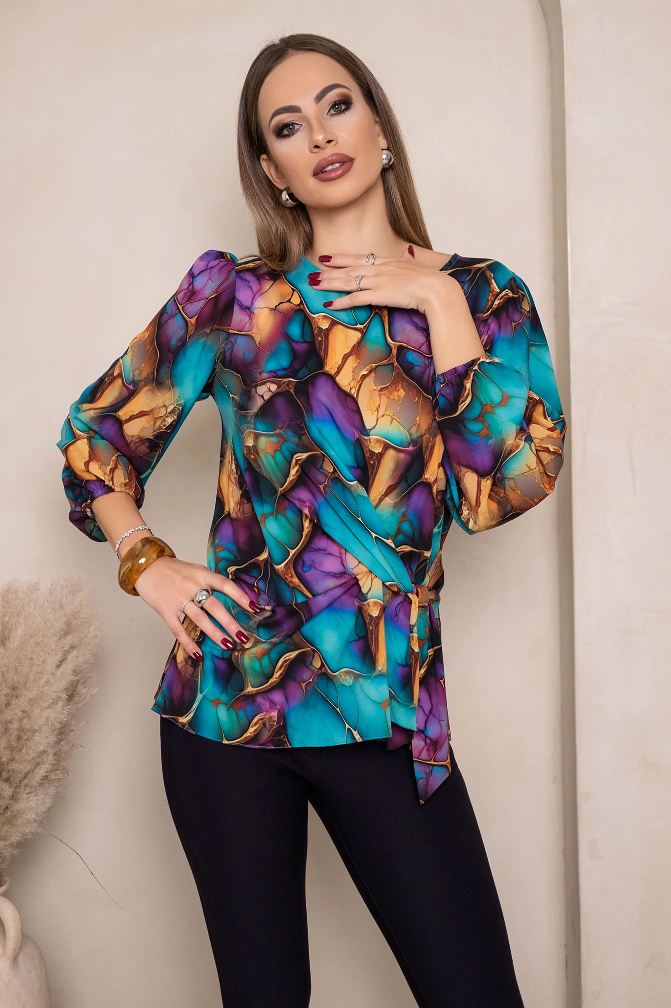 Lezser fazonú, anyagában mintás, selymes-fényes blúz. Hosszú ujjai fodorban és kötőkében végződnek.