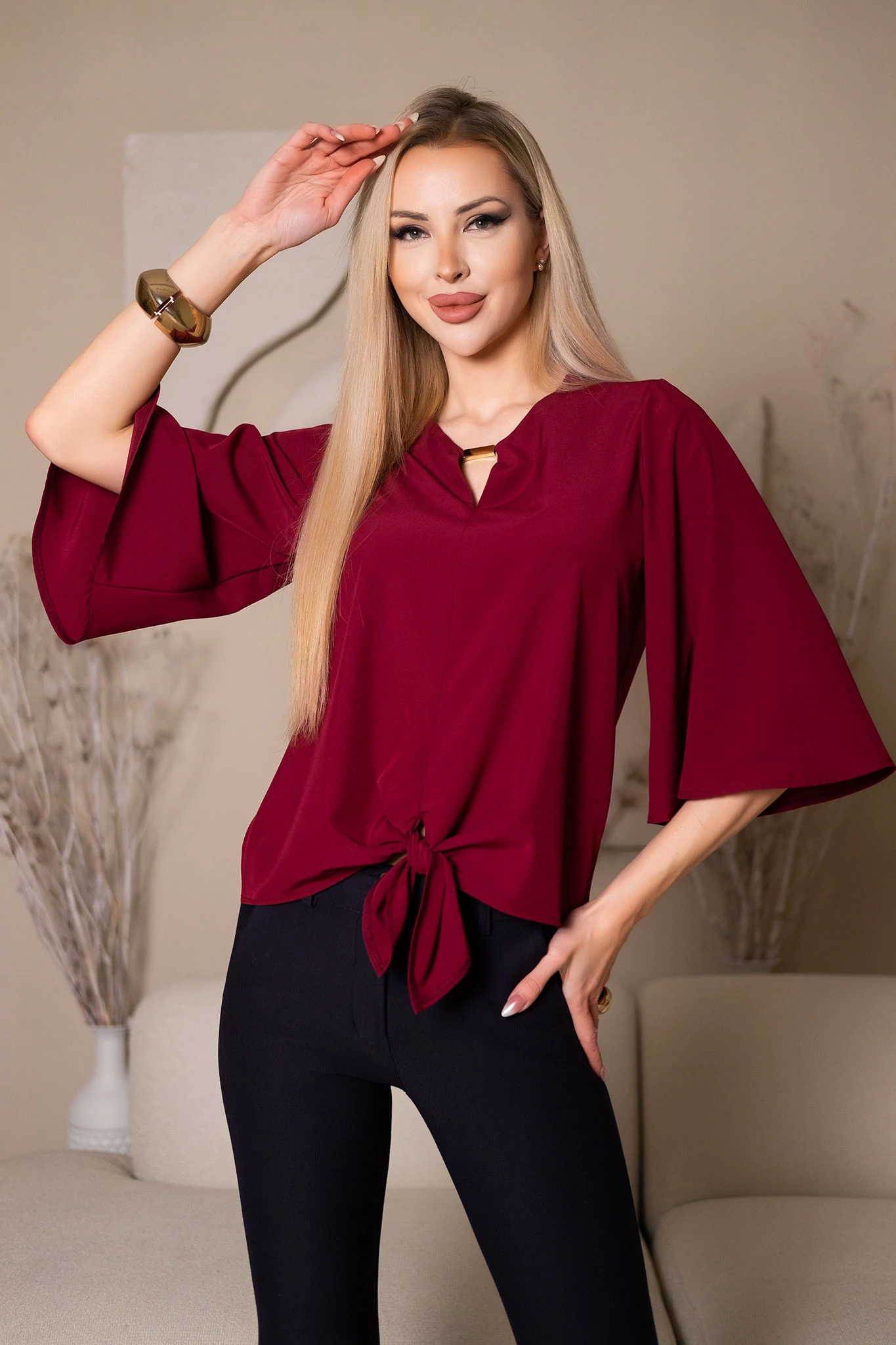 Lezser szabású blúz alján megkötővel. Tulipán ujjakkal és a dekoltázsnál kialakított hasítékkal készült, melyet fémes applikáció díszít. Kényelmes és könnyen kombinálható darab. Anyagösszetétel: 95% polészter, 5% elasztán |