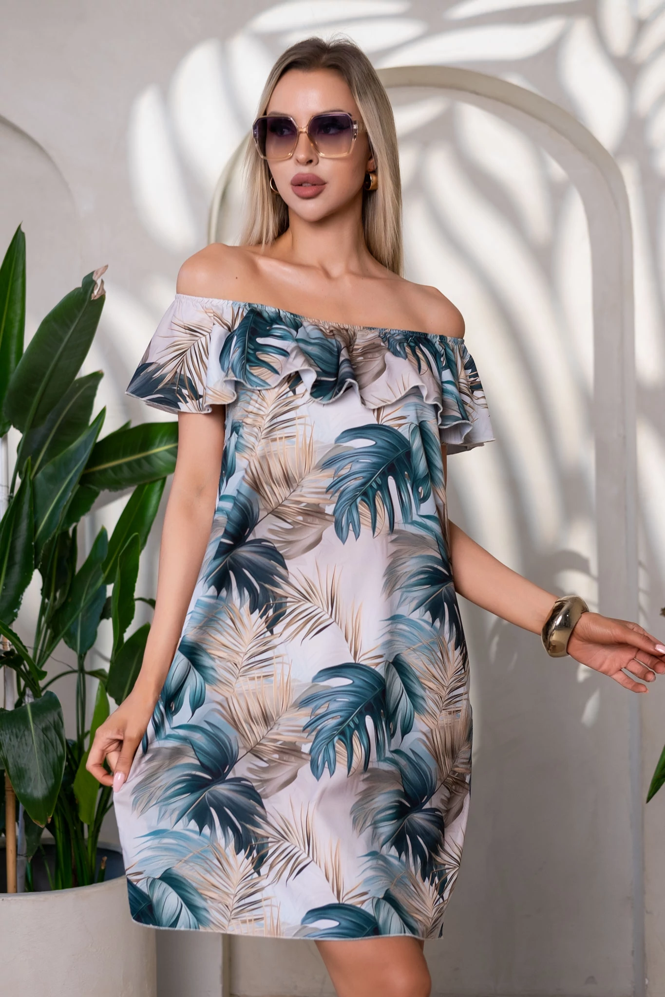 Lezser fazonú ruha, gumis-fodros csónaknyakkal. Anyagösszetétel: 95% viszkóz, 5% elasztán |