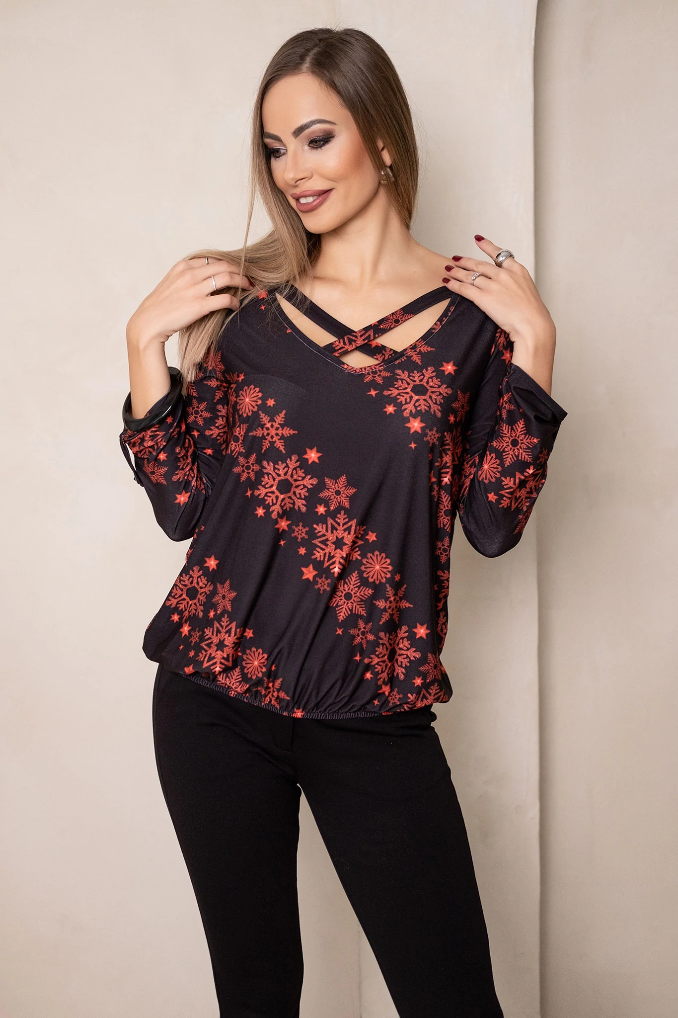 Laza szabású, ejtettvállú, forgatható felső. Válaszd ki hangulatod szerint, hogy csónaknyakúként feszed fel, hátul keresztes díszítéssel, vagy "V" nyakúként, elején keresztpántos díszítéssel.