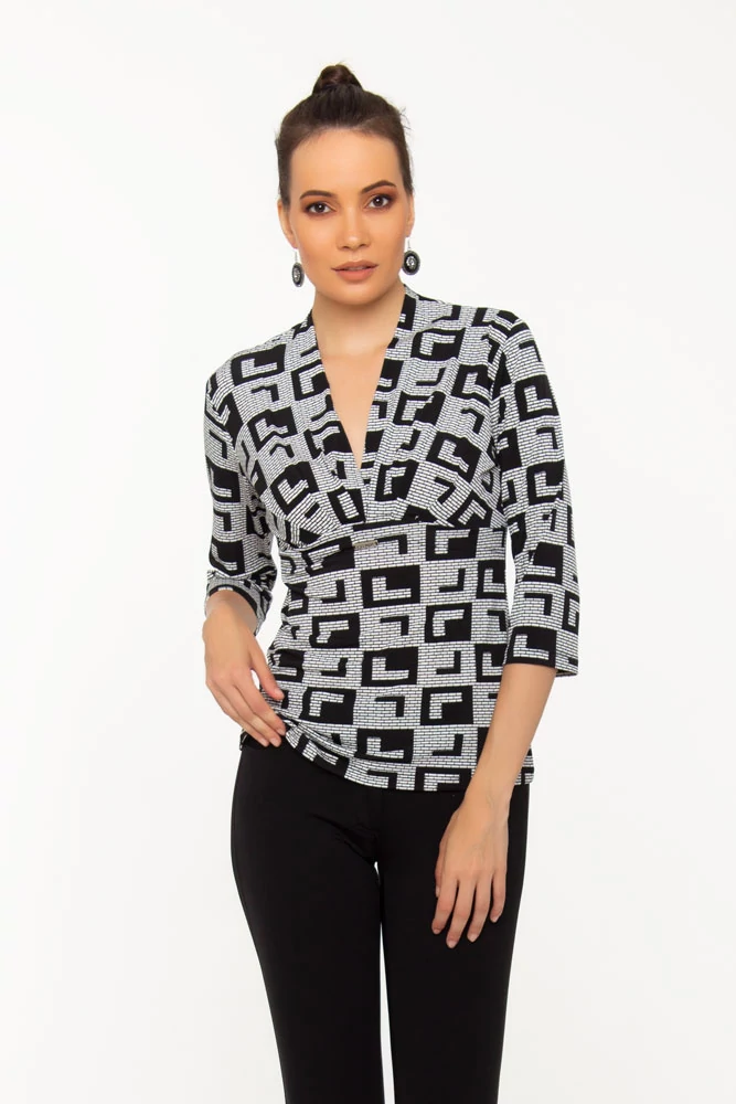 Lezser fazonú felső, dekoltázsán ékformájú hasítékkal. Ujja vége passzés, alja gumírozva. Anyagában görögmintás.