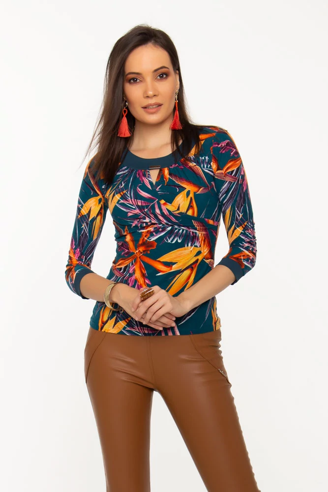 Testhezálló fazonú, 3/4-es ujjú felső. Csónaknyaka elegáns ékbetéttel díszített, ujjai passzéban végződnek.